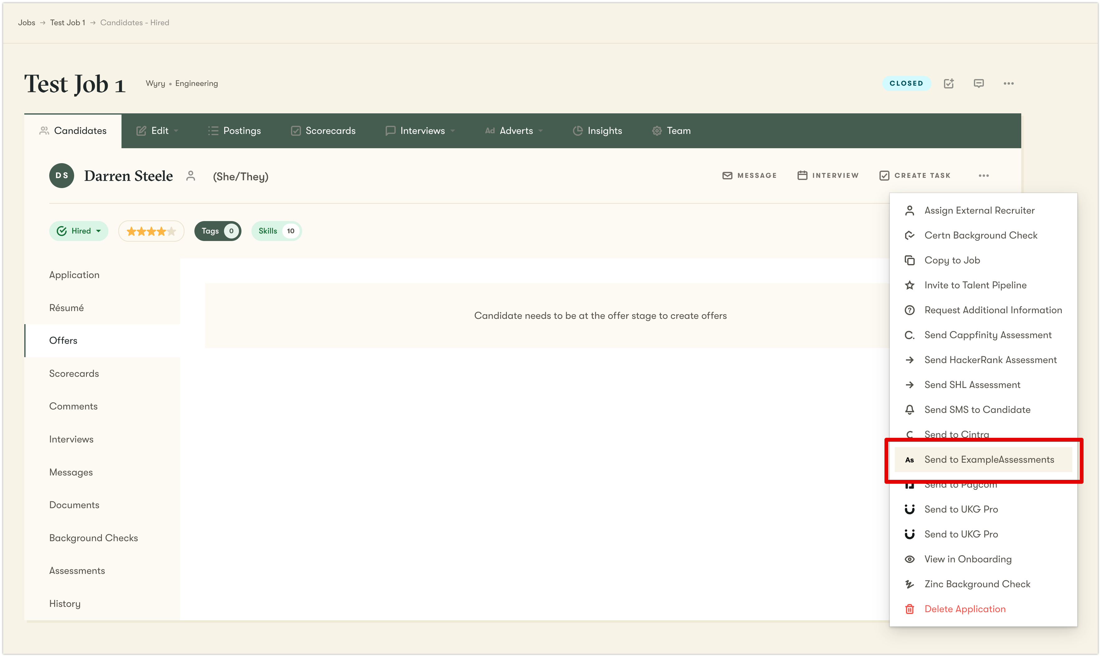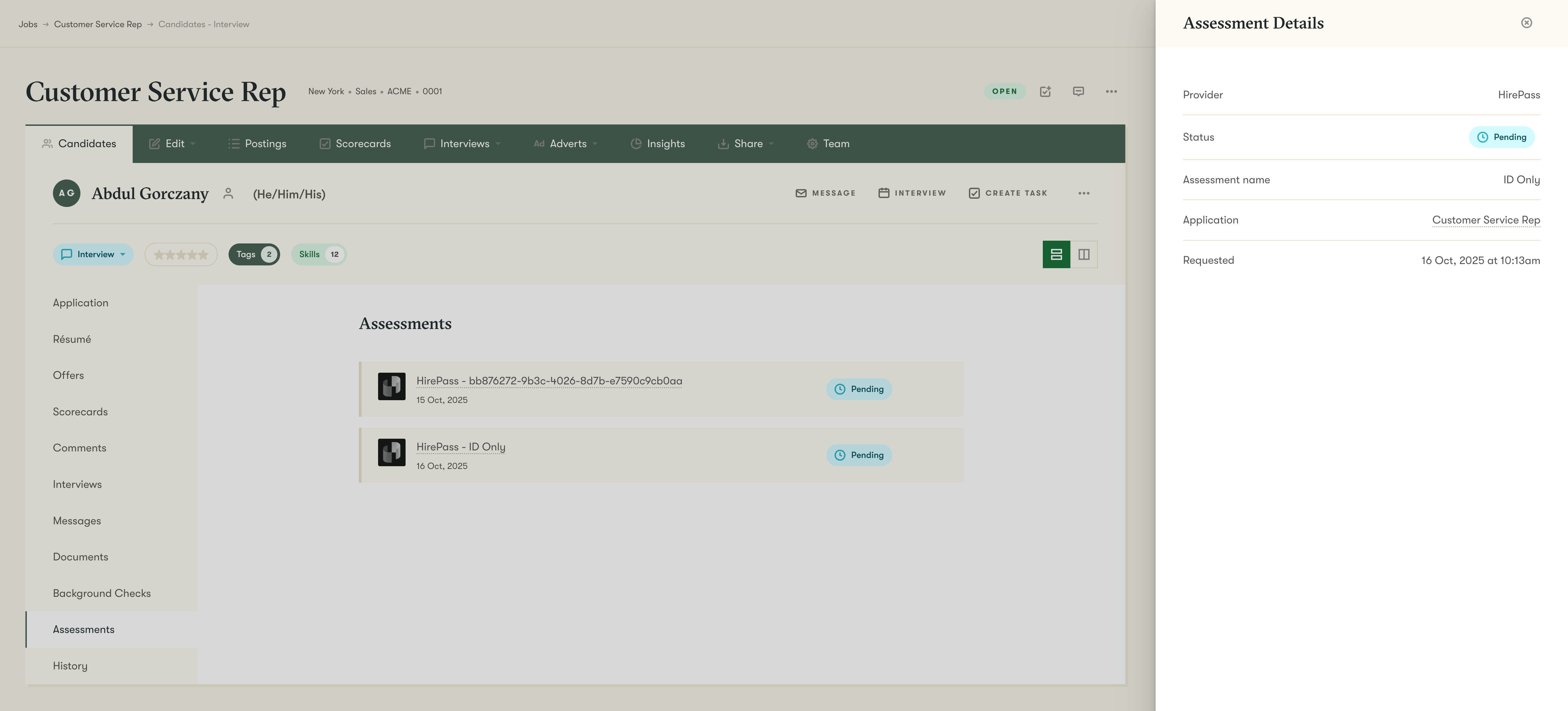 The createAssessment action enables users to send candidate information to an external assessment provider.