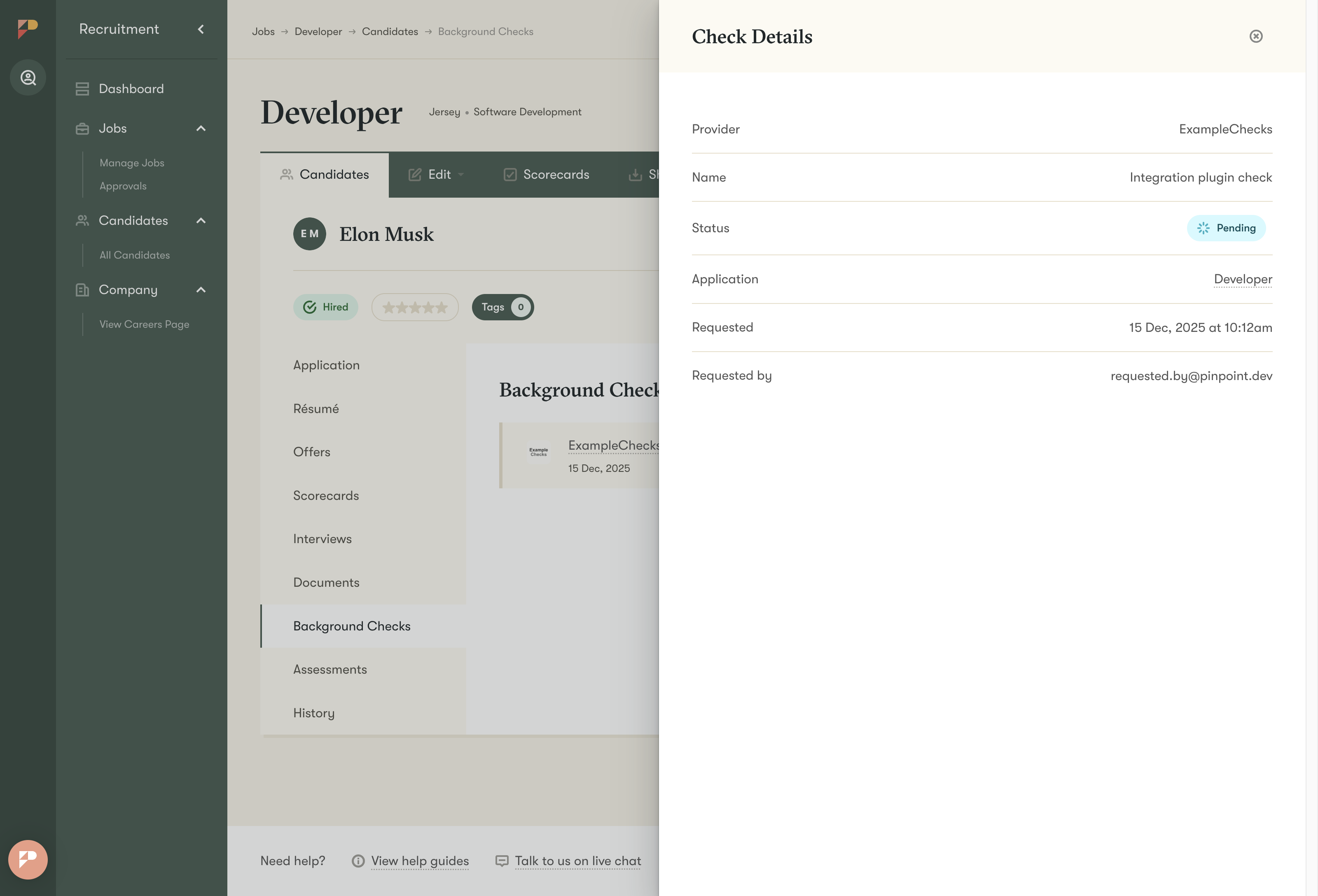 - Pinpoint updates the Background Check record and sends notifications about the completed background check (if requested by the plugin)