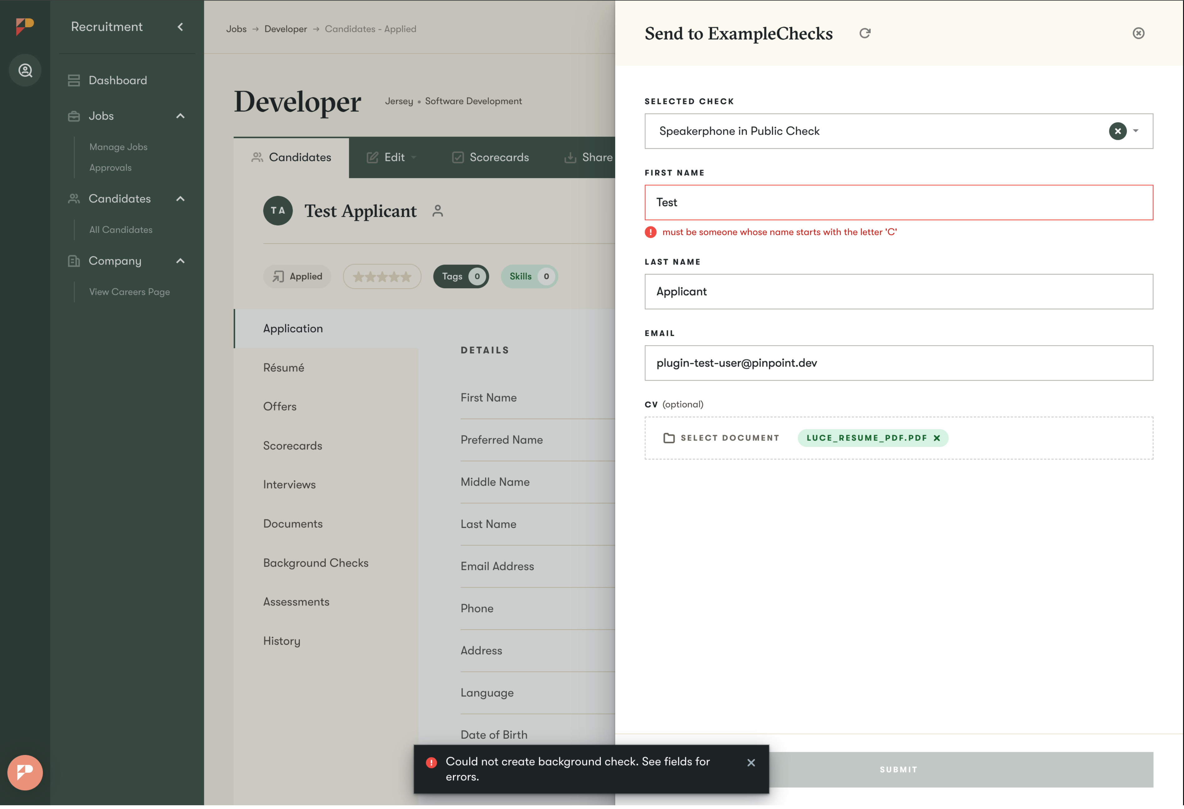 The createBackgroundCheck action enables users to send candidate information to an external background check provider.