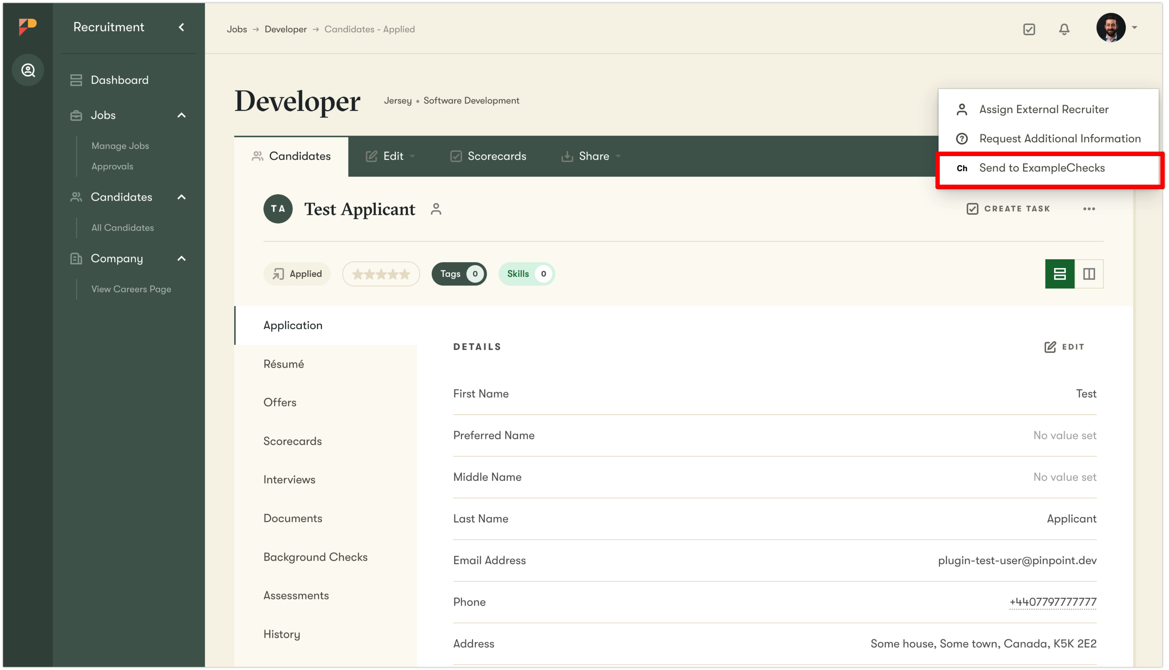 User initiates "Send to ExampleBackgroundChecks" action (where ExampleBackgroundChecks is the name of the background check provider/service defined by the plugin configuration)