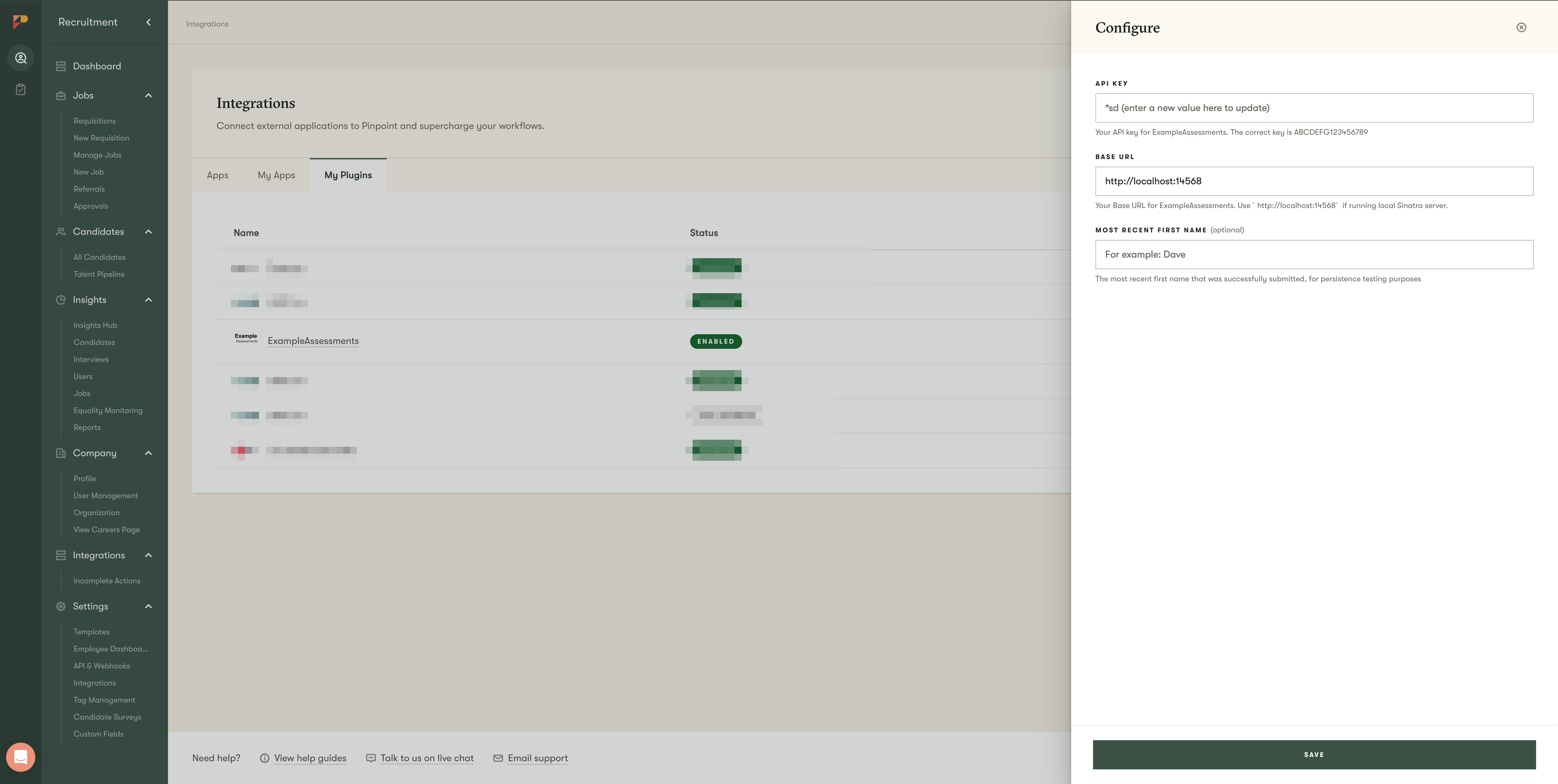 configurationFormFieldsin your plugin's Meta Endpoint response. - Pinpoint renders these as a form in the Integrations → My Plugins → Configure panel.