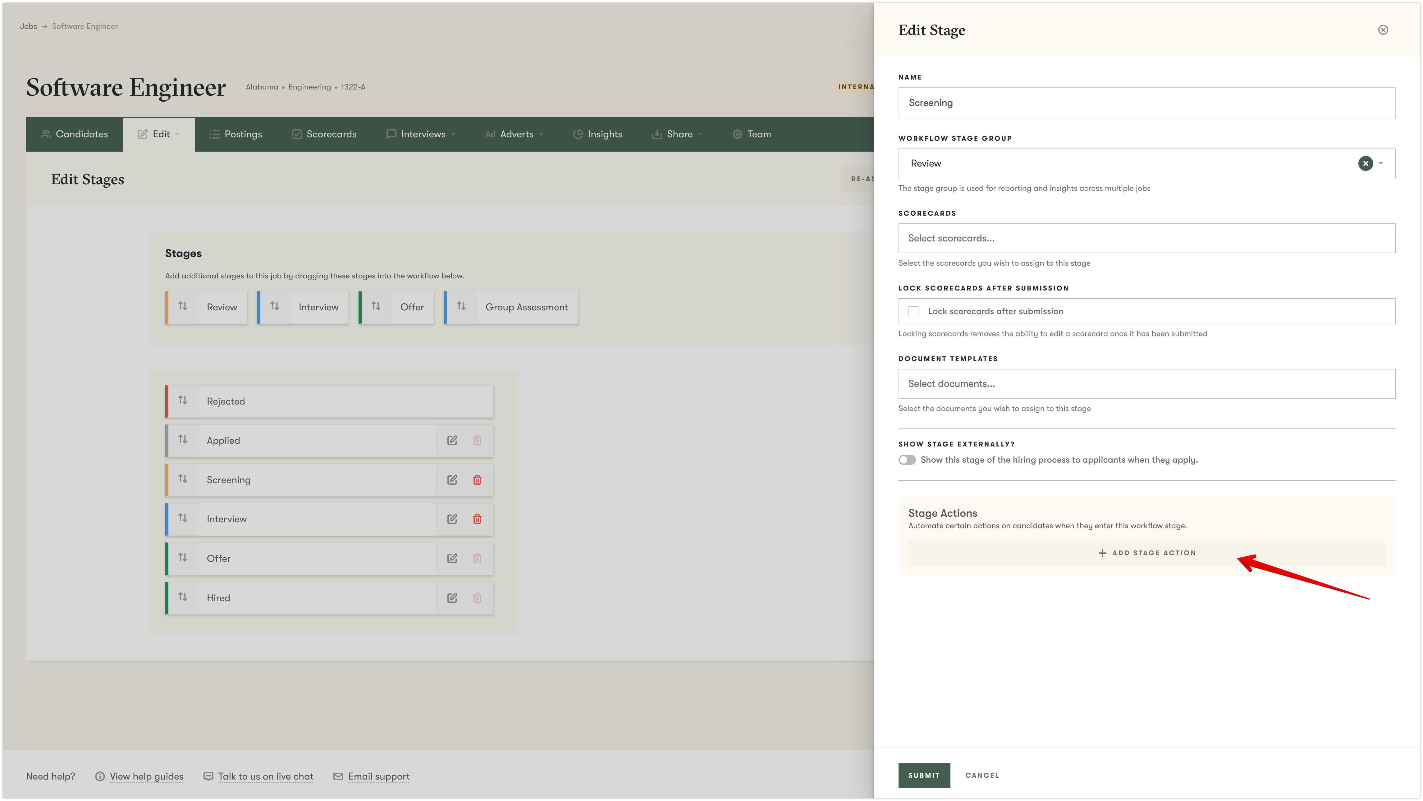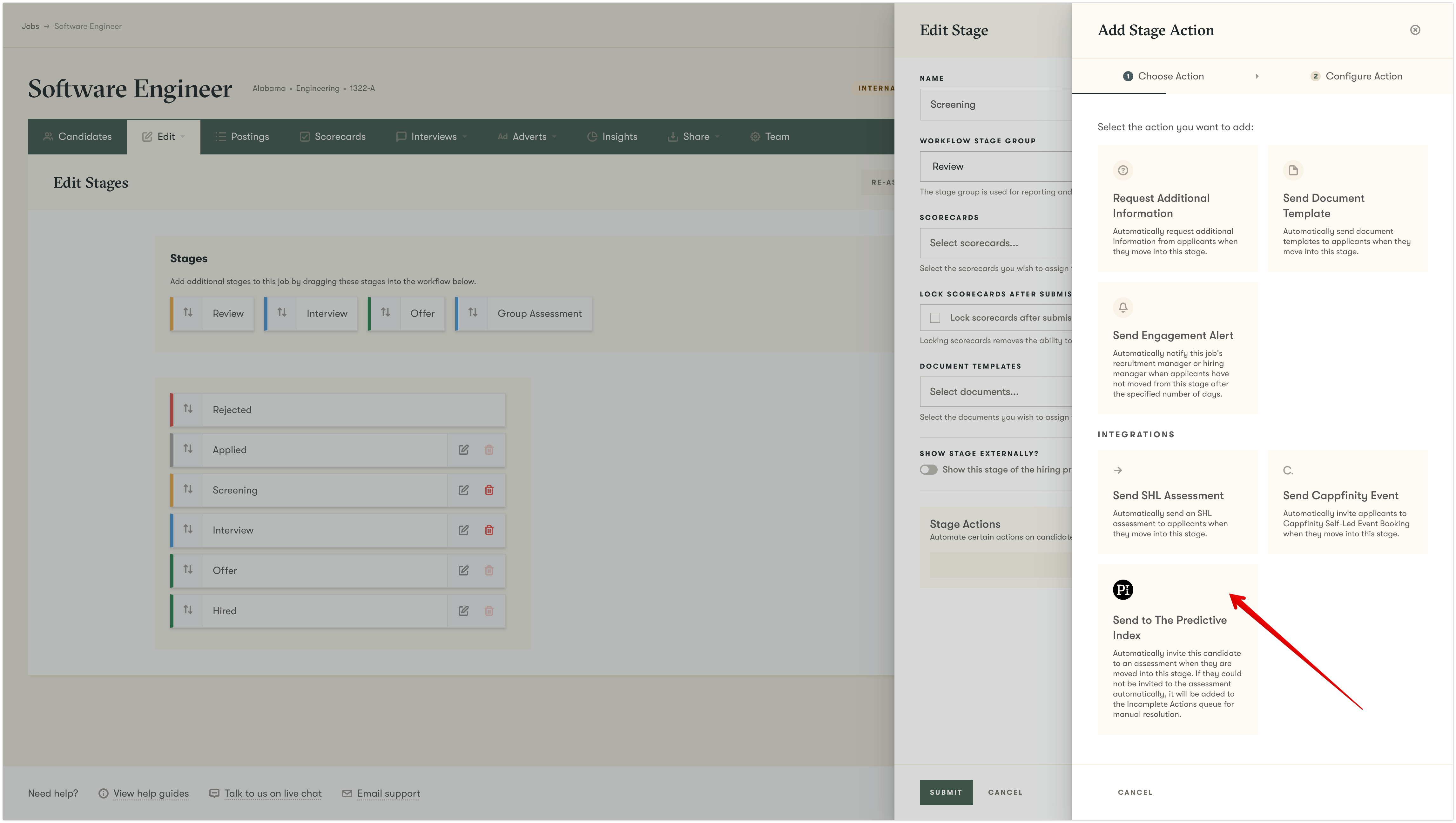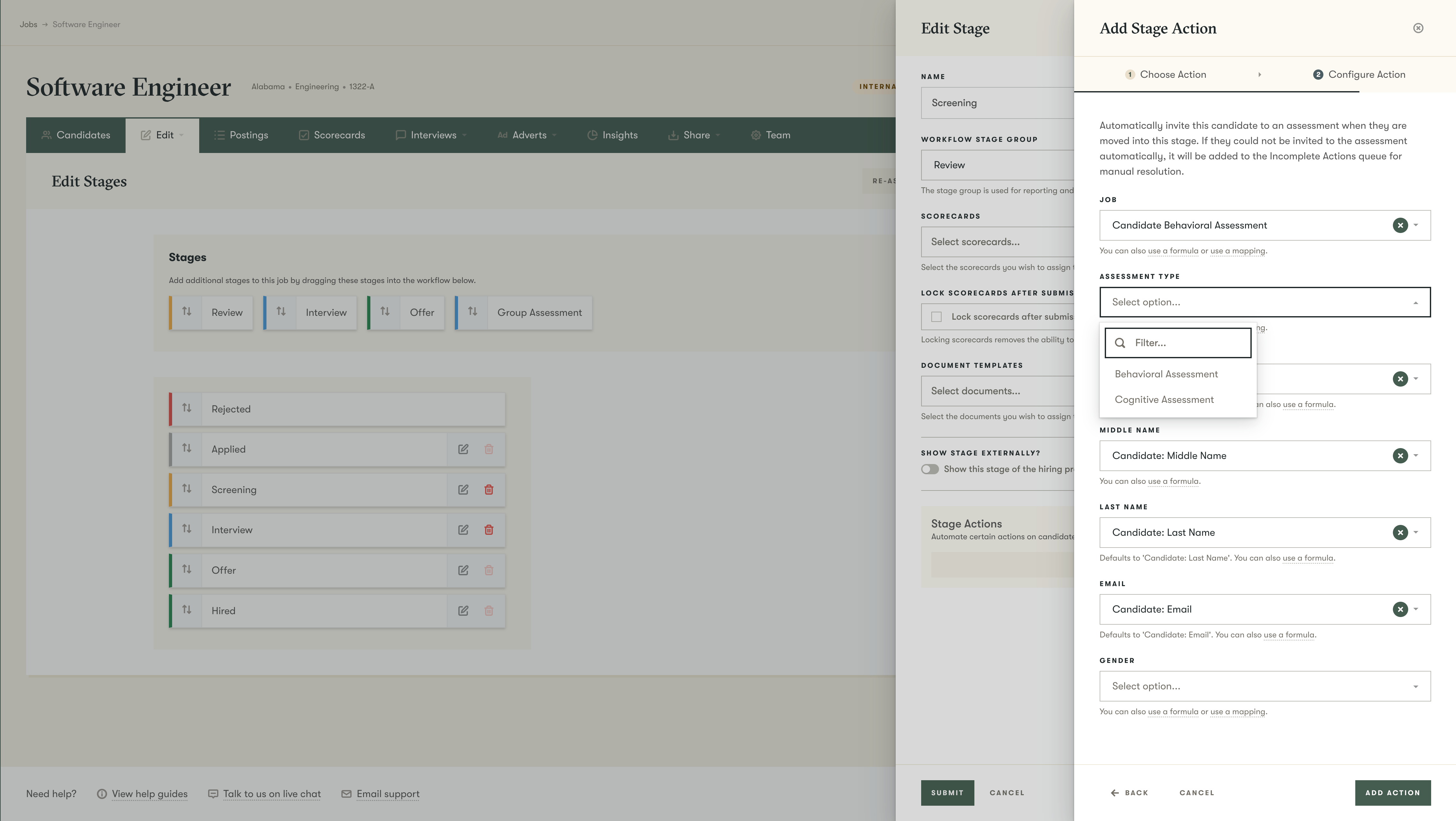 When a candidate is later moved into that stage, the action executes automatically with the configured values.