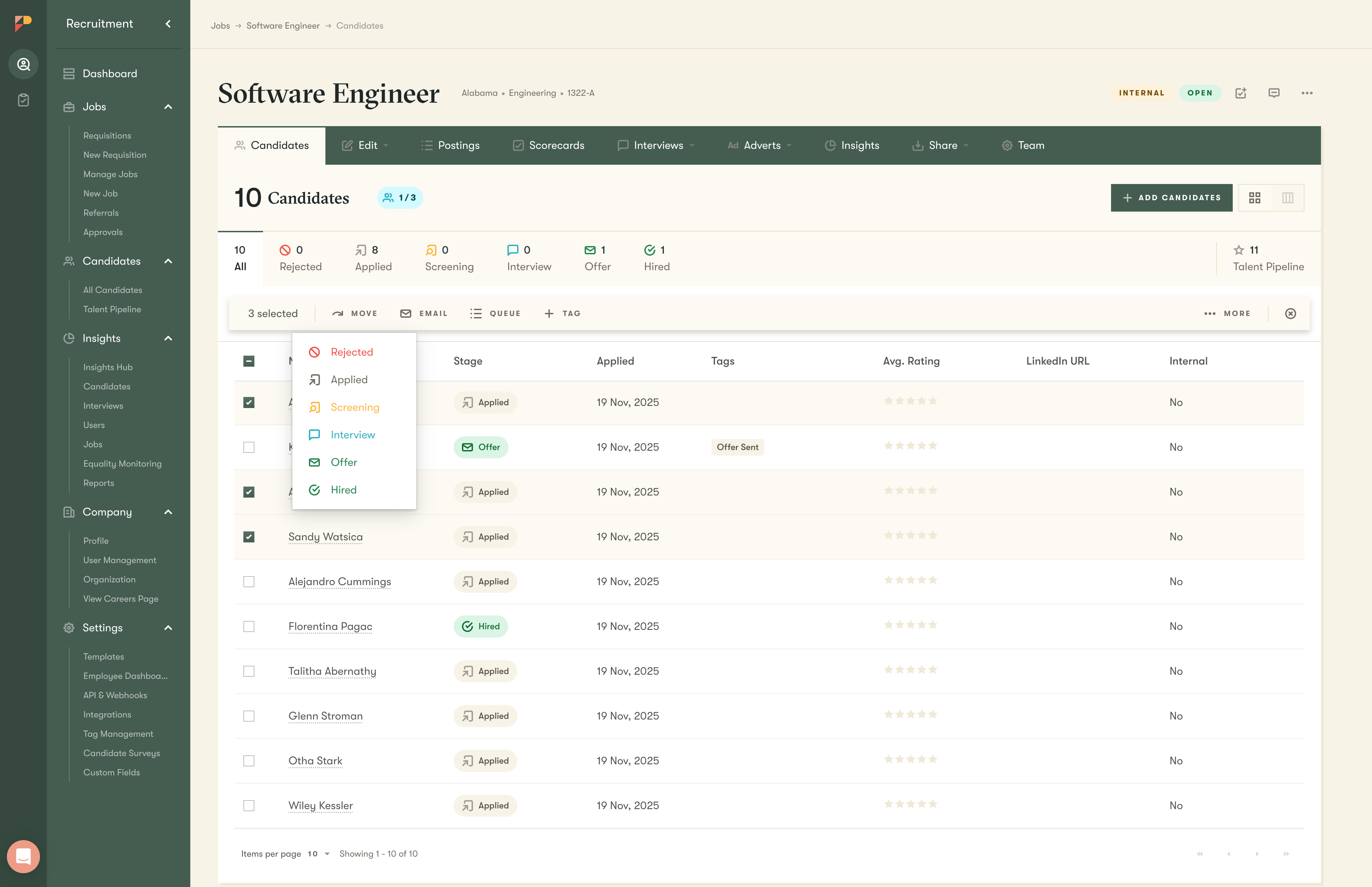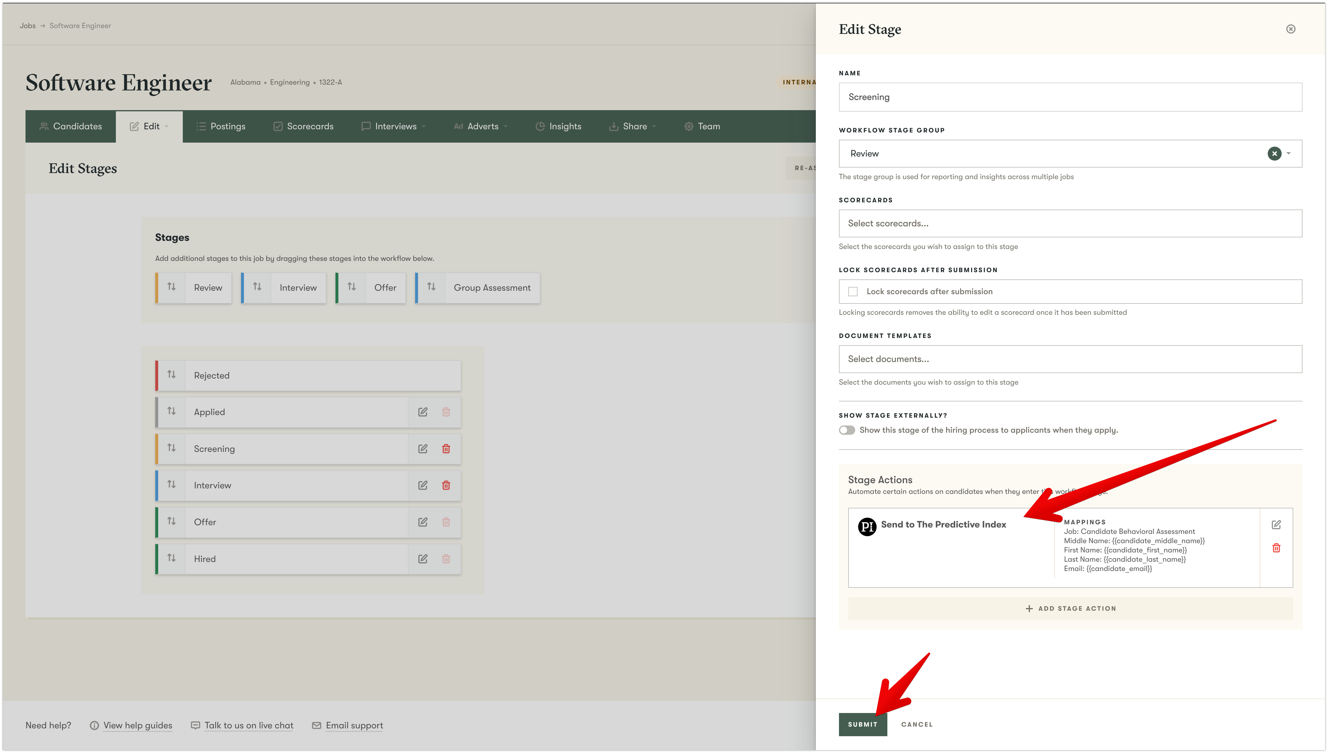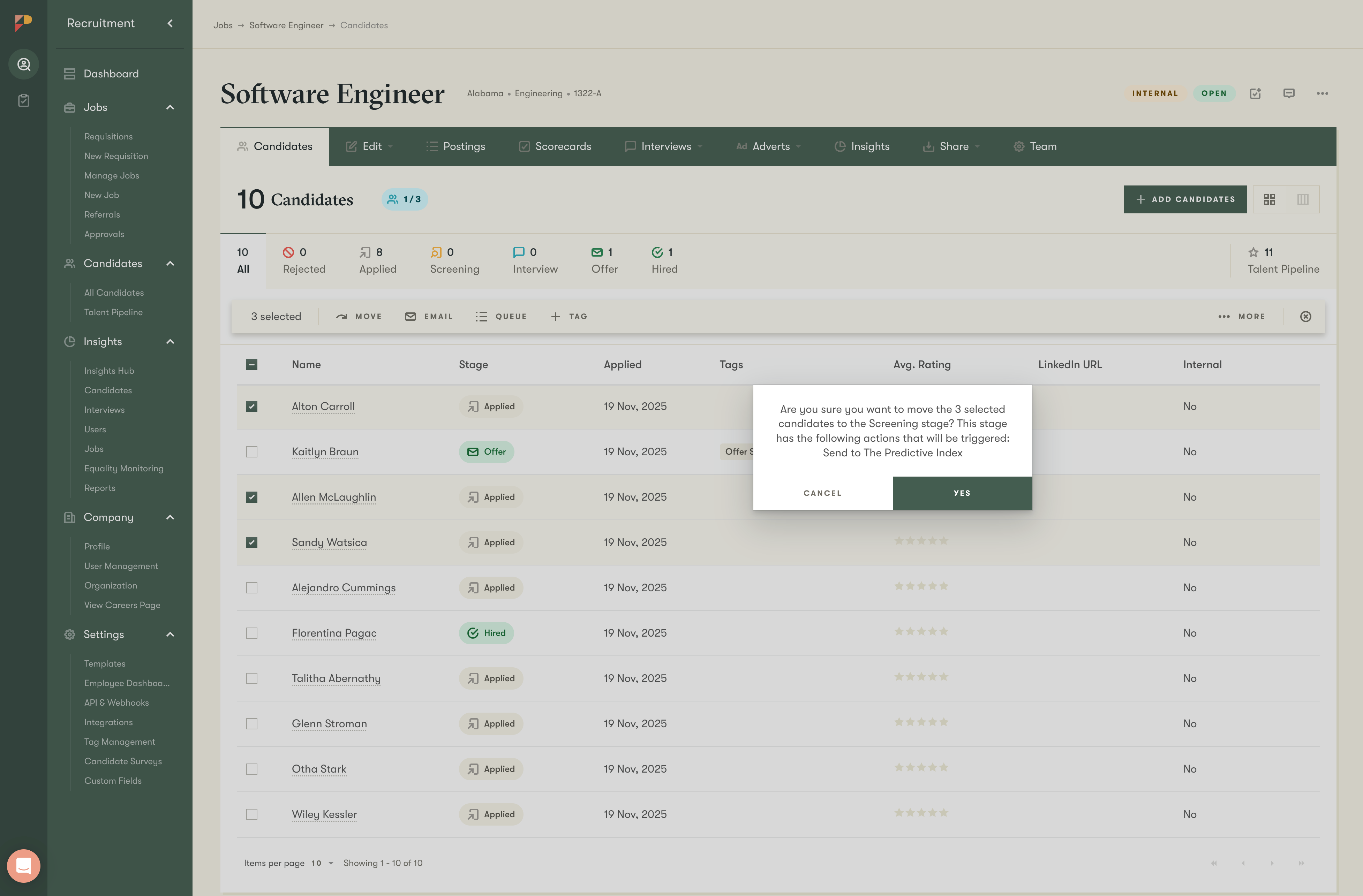 When a candidate is later moved into that stage, the action executes automatically with the configured values.